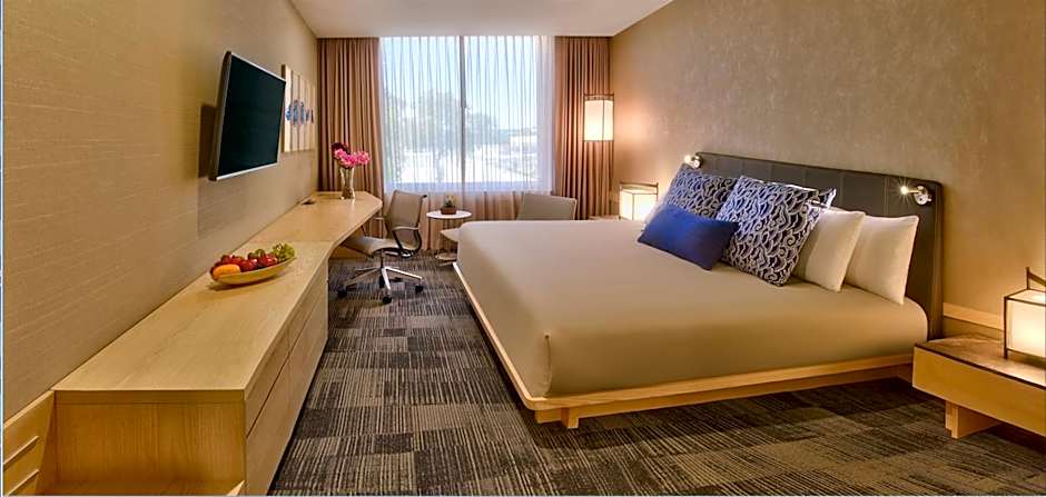 108.26 ft, Contemporary Asian Design, a king bed, air conditioning, internet wi-fi, bathroom with rain shower, hair dryer, vanity mirror, 42” flat screen TV, ironing set, safety deposit box, desk with multicontacts station, Herman Miller chair, telephone, radio.
